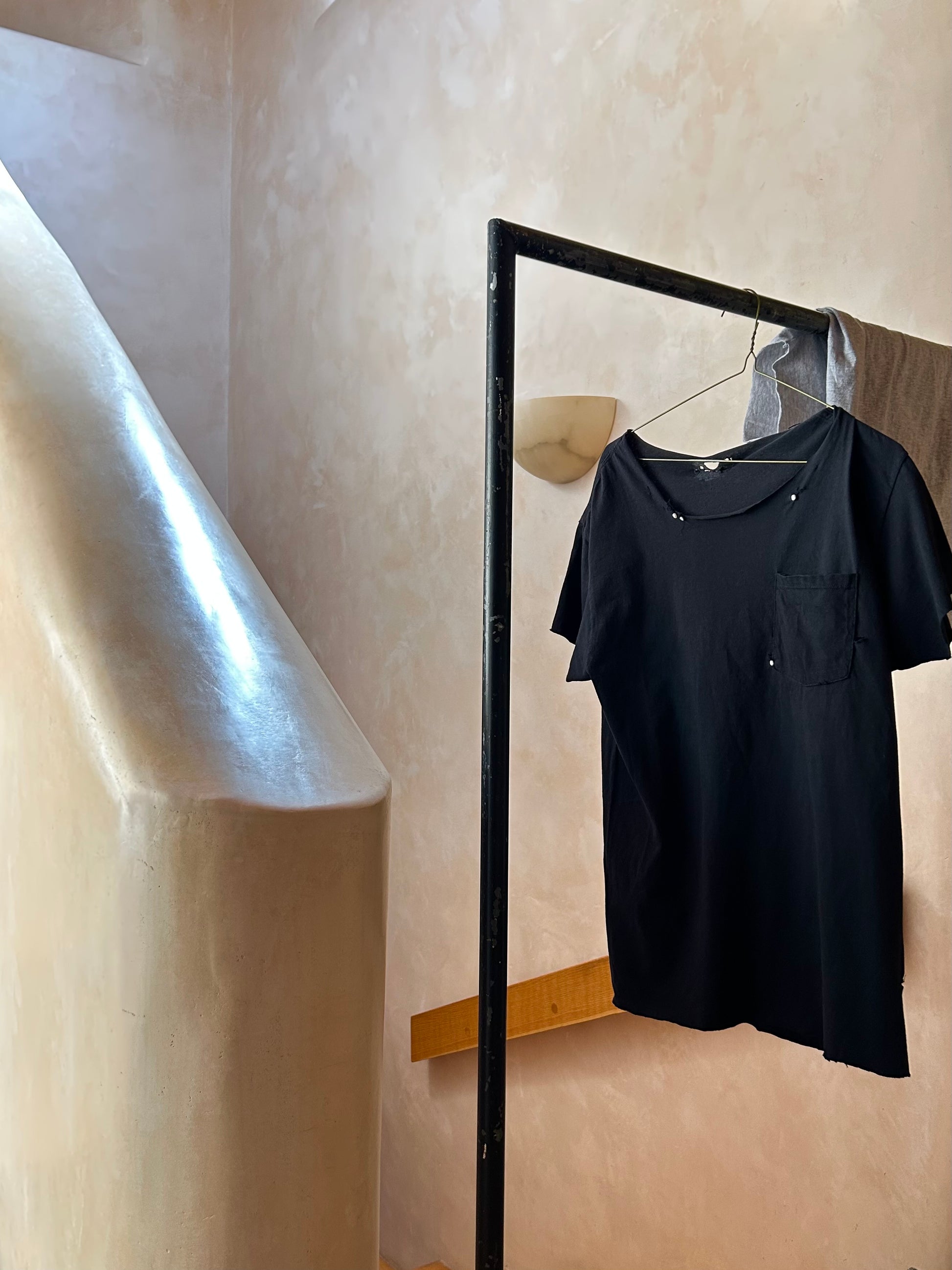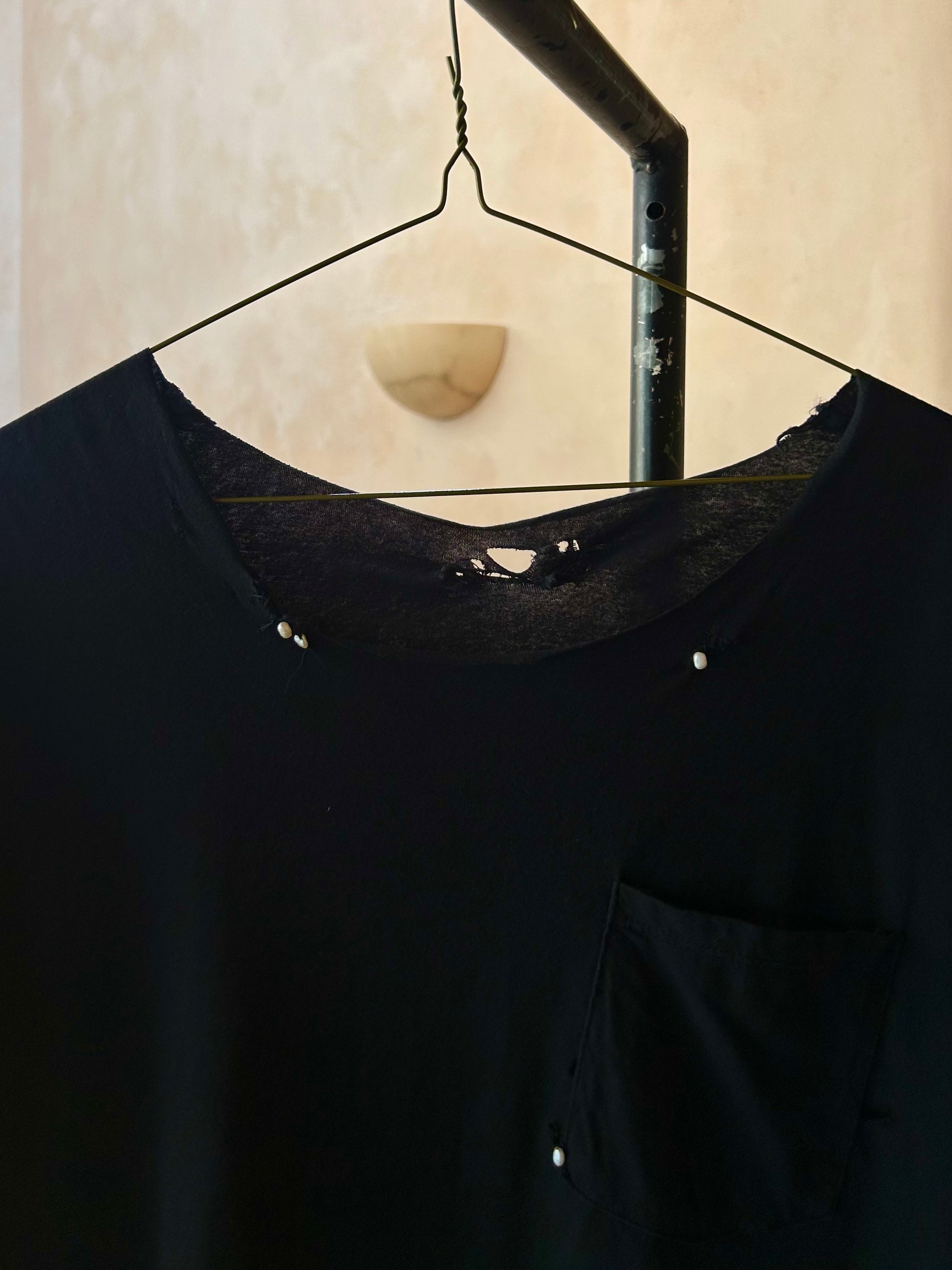 Vintage, gently distressed black T-Shirt hand-stitched and detailed with natural freshwater peals. Each T-Shirt is one of a kind and made by hand in NYC and Santa Fe.