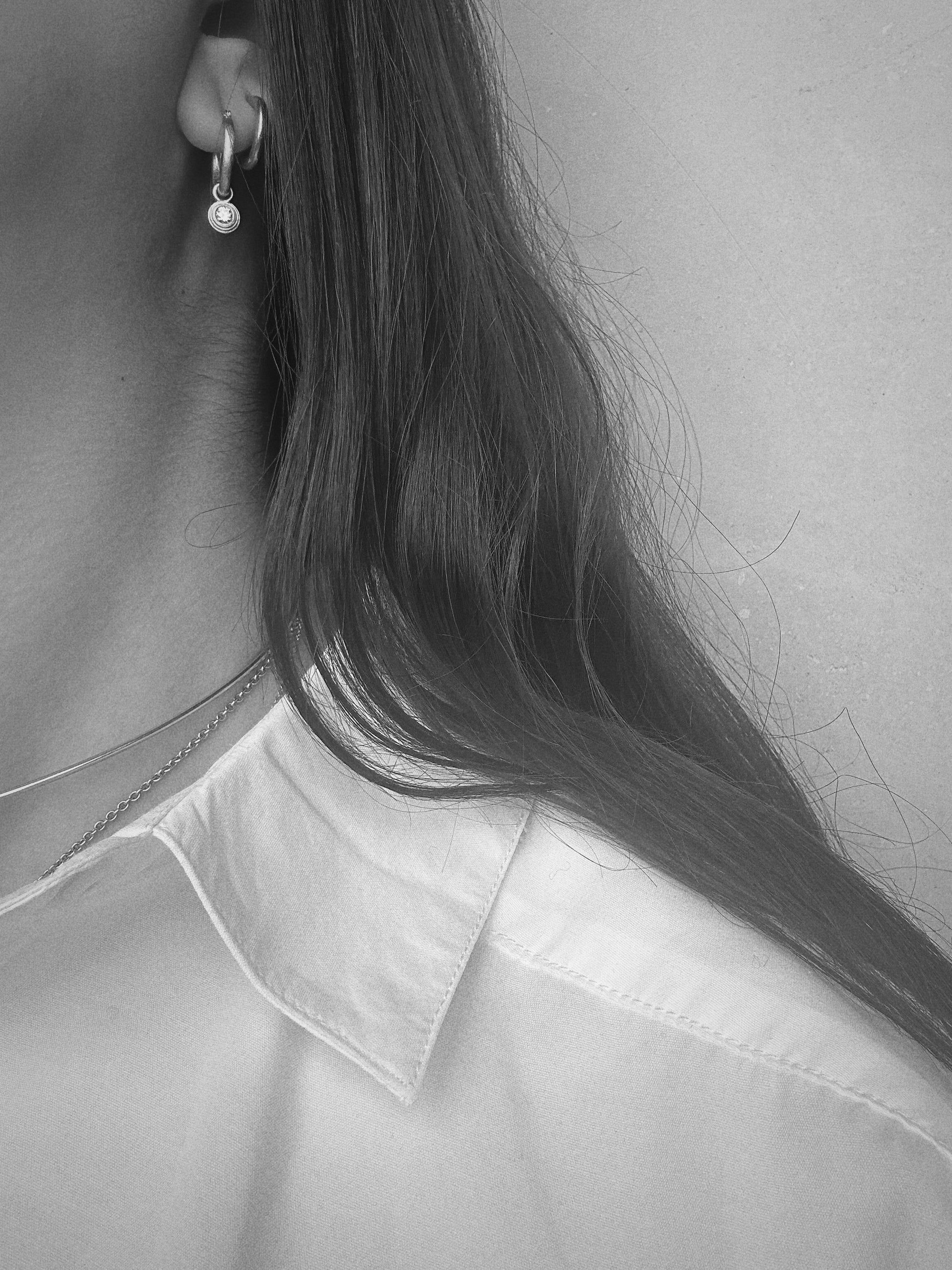 Can be worn on 18k gold Everyday Hoop Earrings, Roe Silver Demi-Hoop Earrings, chain, or string.